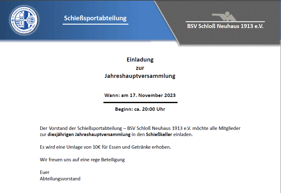 am 17. November 2023 findet die jährliche Jahreshauptversammlung der Schießsportabteilung im Schießkeller statt. Die Versammlung beginnt ca. 20:00 Uhr Es wird eine Umlage von 10 Euro erhoben. Der Vorstand freut sich über eine rege Beteiligung und schöne Gespräche.